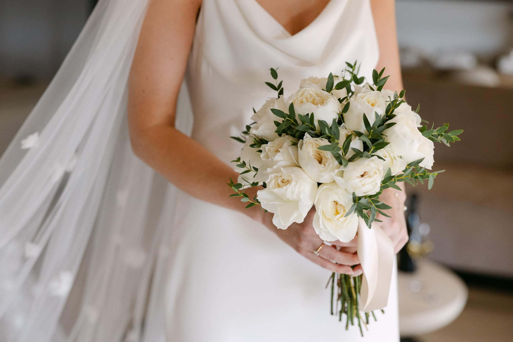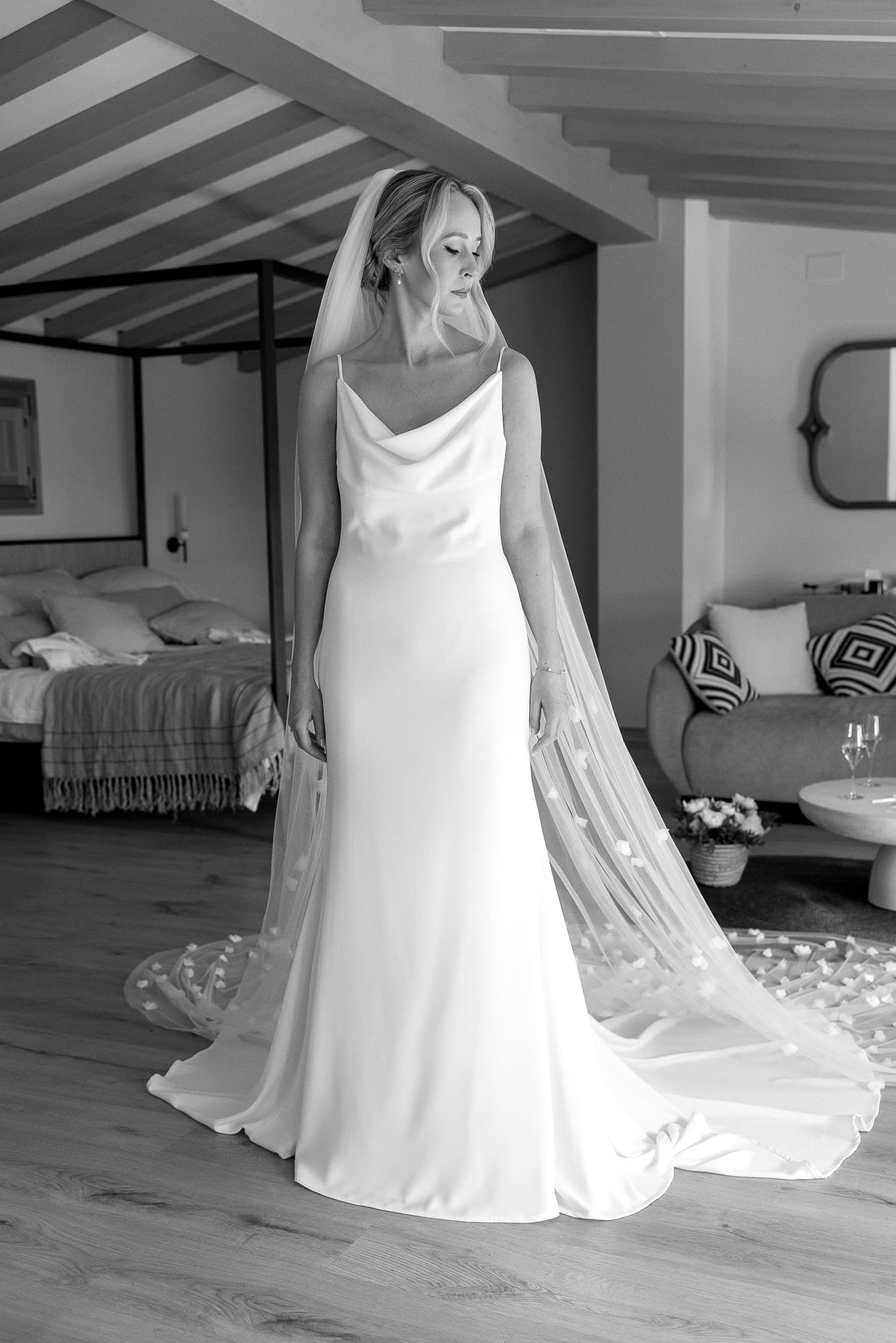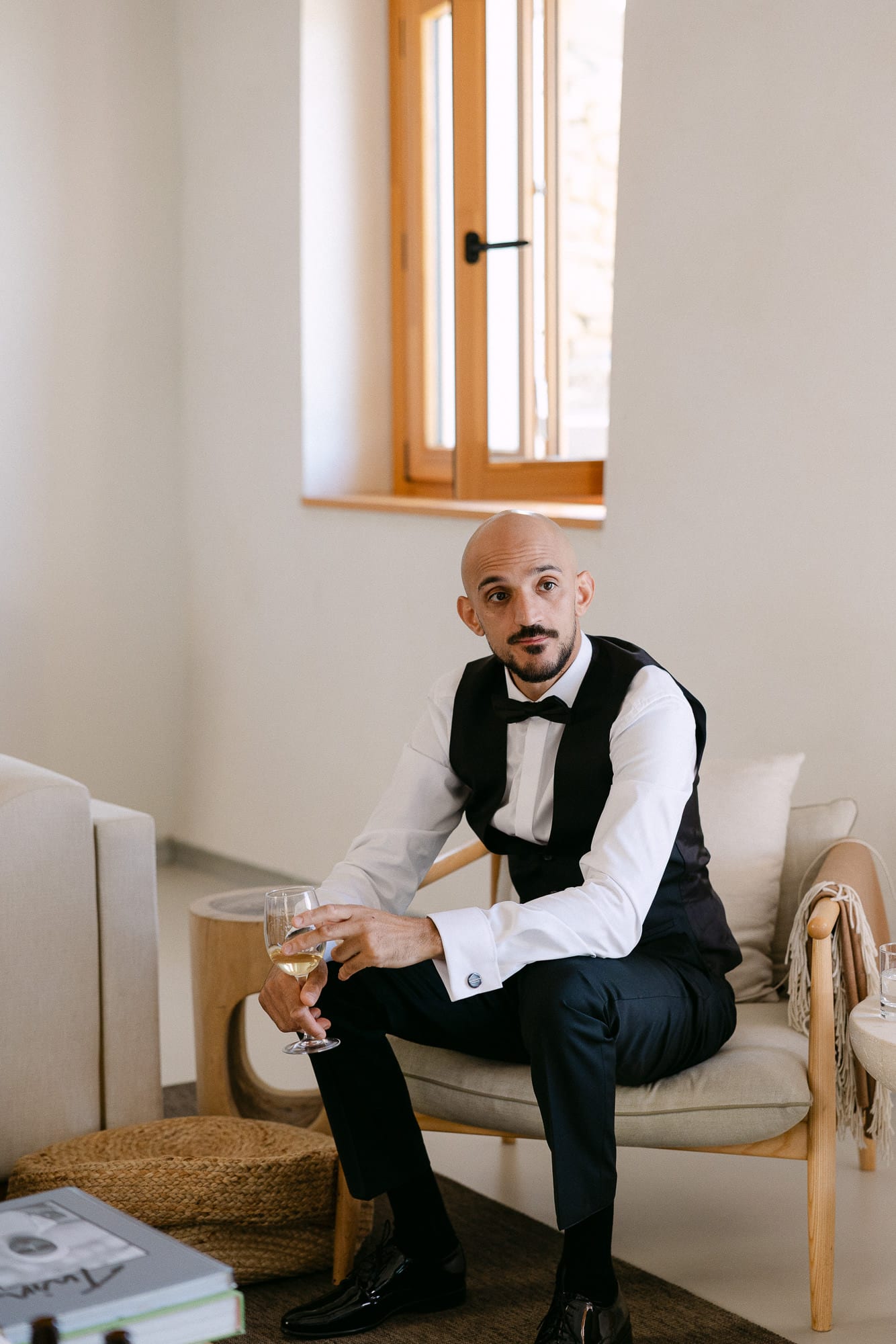La pareja se vistió en la masia, con la luz entrando por los ventanales y las paredes blancas ofreciendo un fondo limpio y elegante. Estos momentos previos, íntimos y relajados, permitieron crear fotografías naturales con estética editorial, capturando la emoción y la calma del inicio del día.