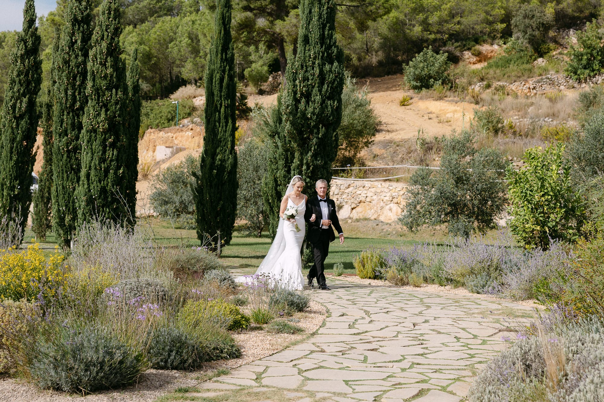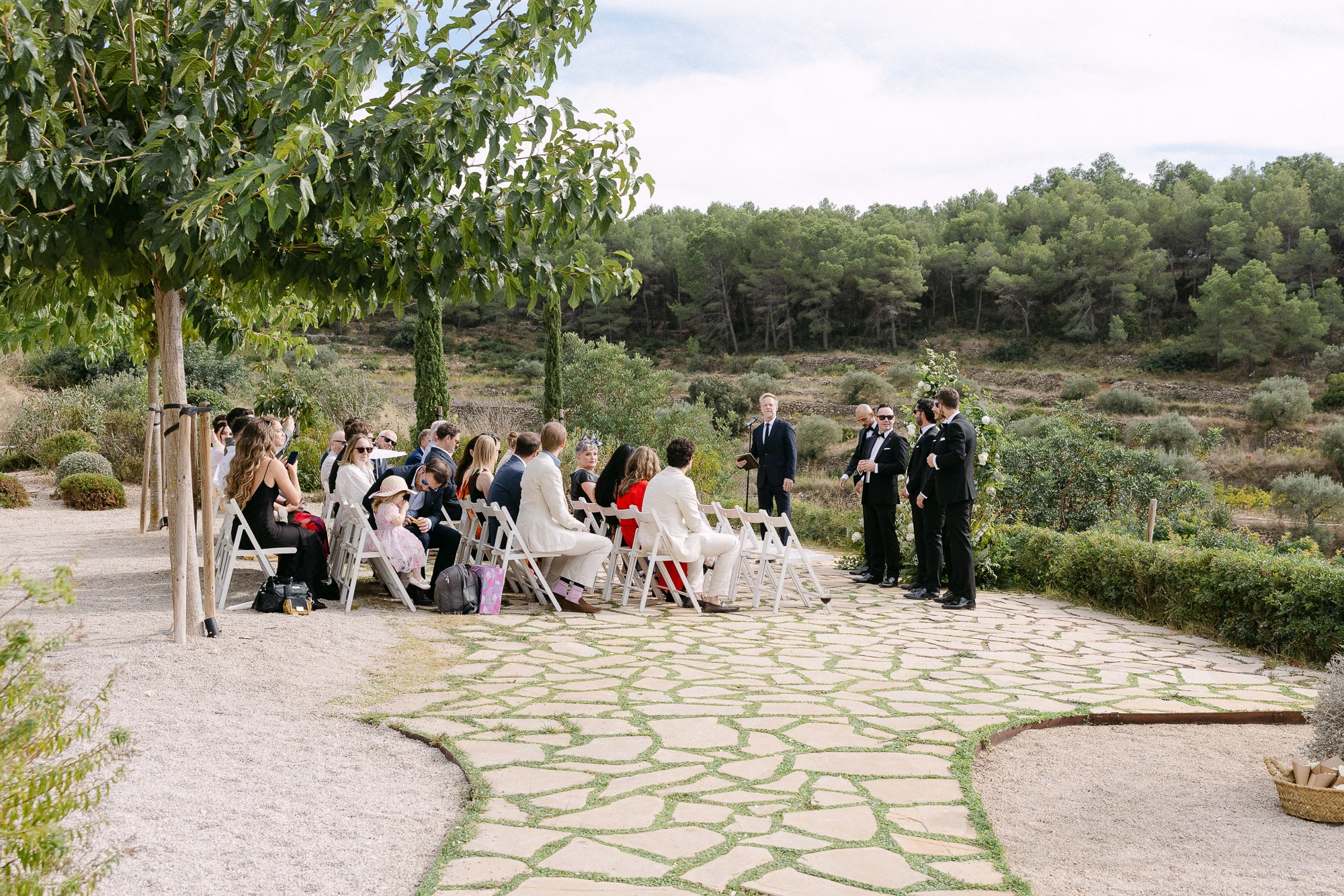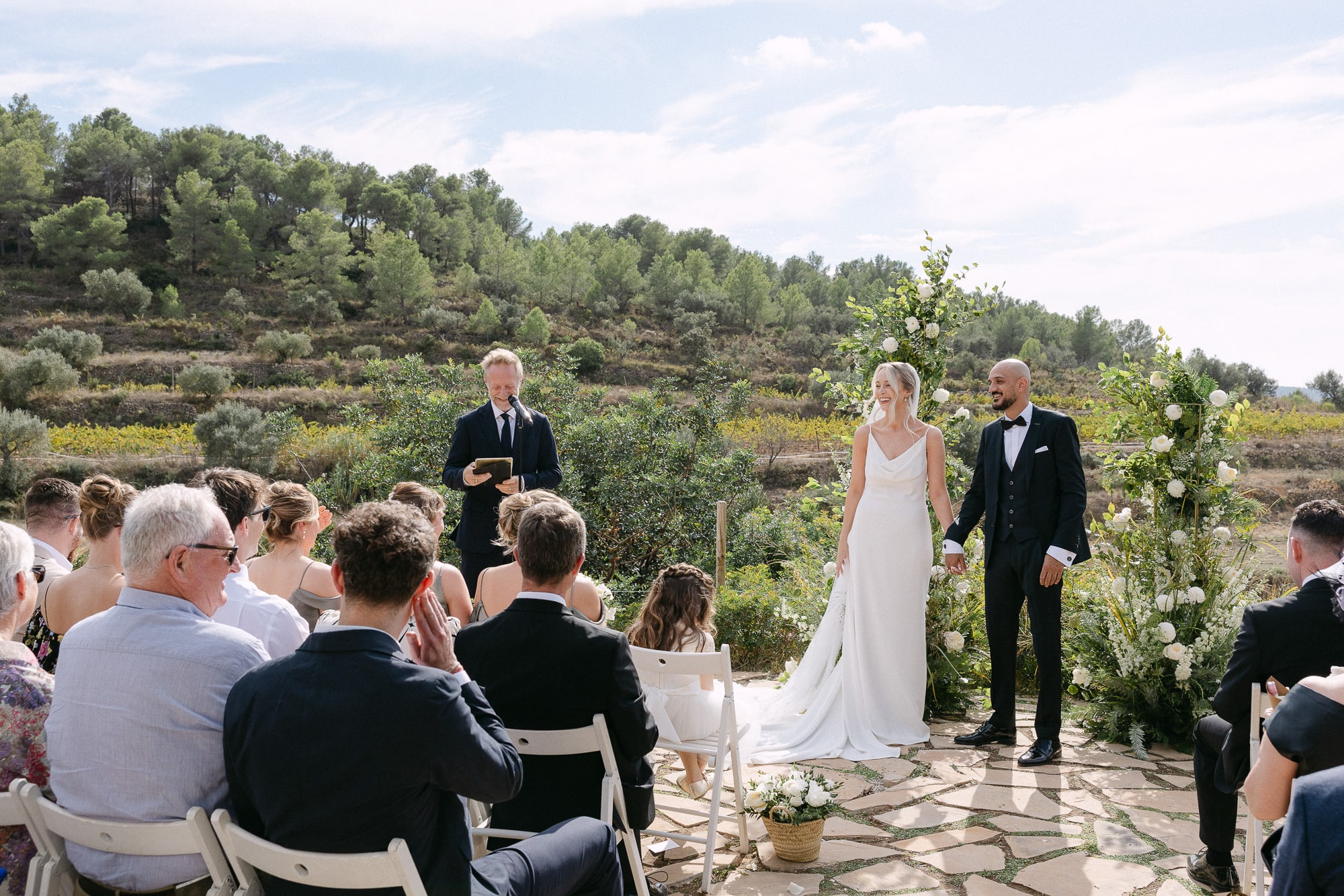 La ceremonia tuvo lugar en el jardín exterior, rodeada de viñas y almendros, bajo el cielo abierto. La luz mediterránea del atardecer y la brisa suave crearon un ambiente elegante y sereno. Los pocos invitados disfrutaron de un espacio íntimo y acogedor, mientras Jillian y Gerard intercambiaban sus votos.