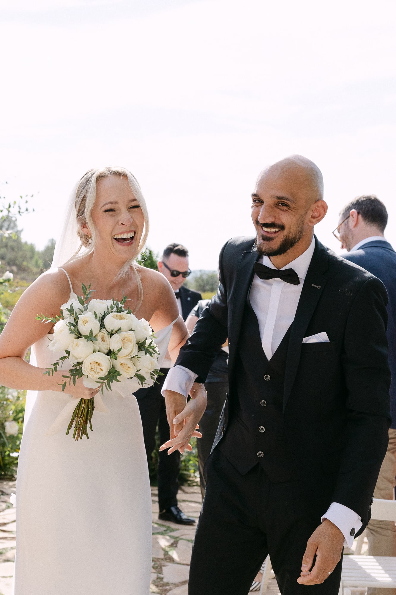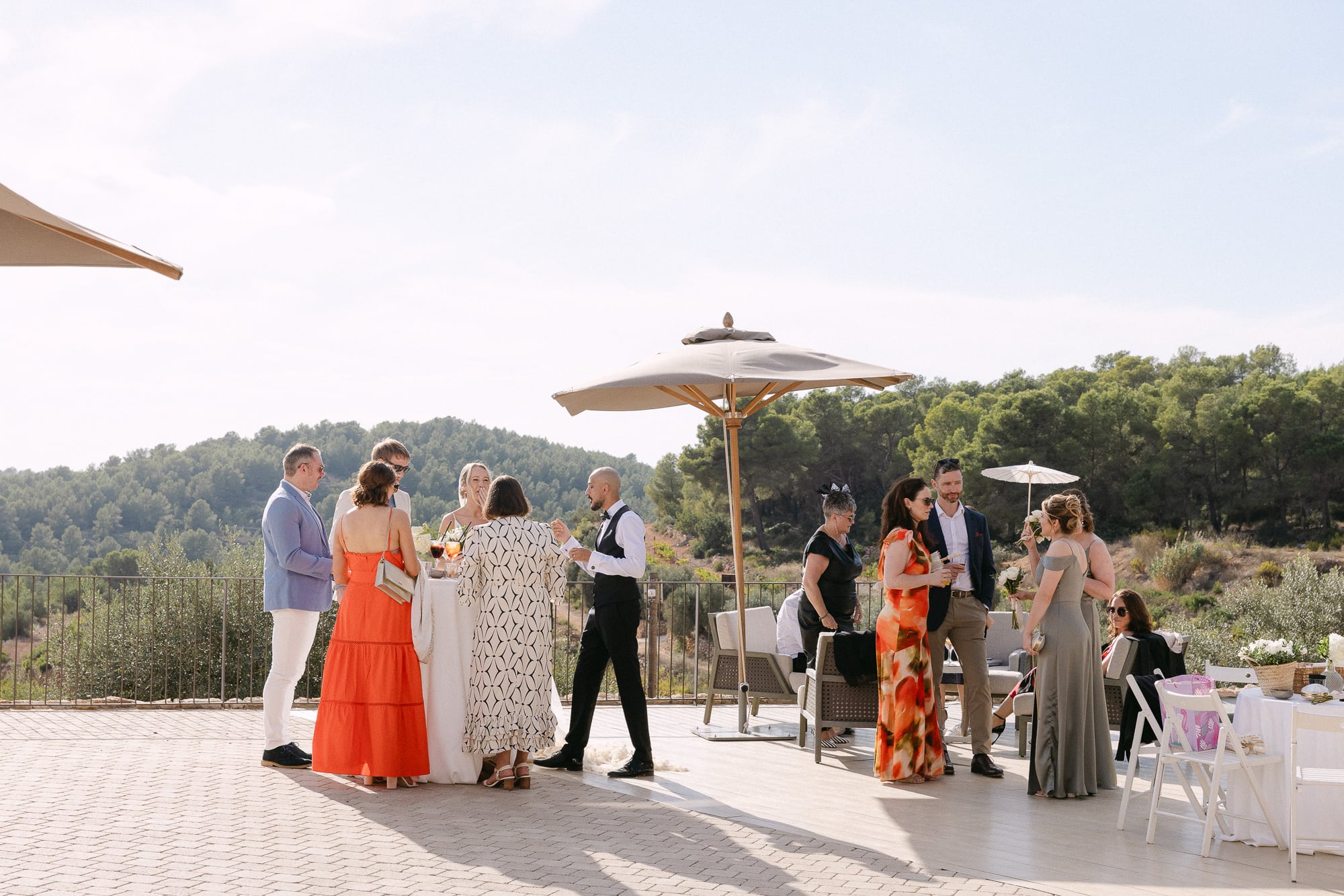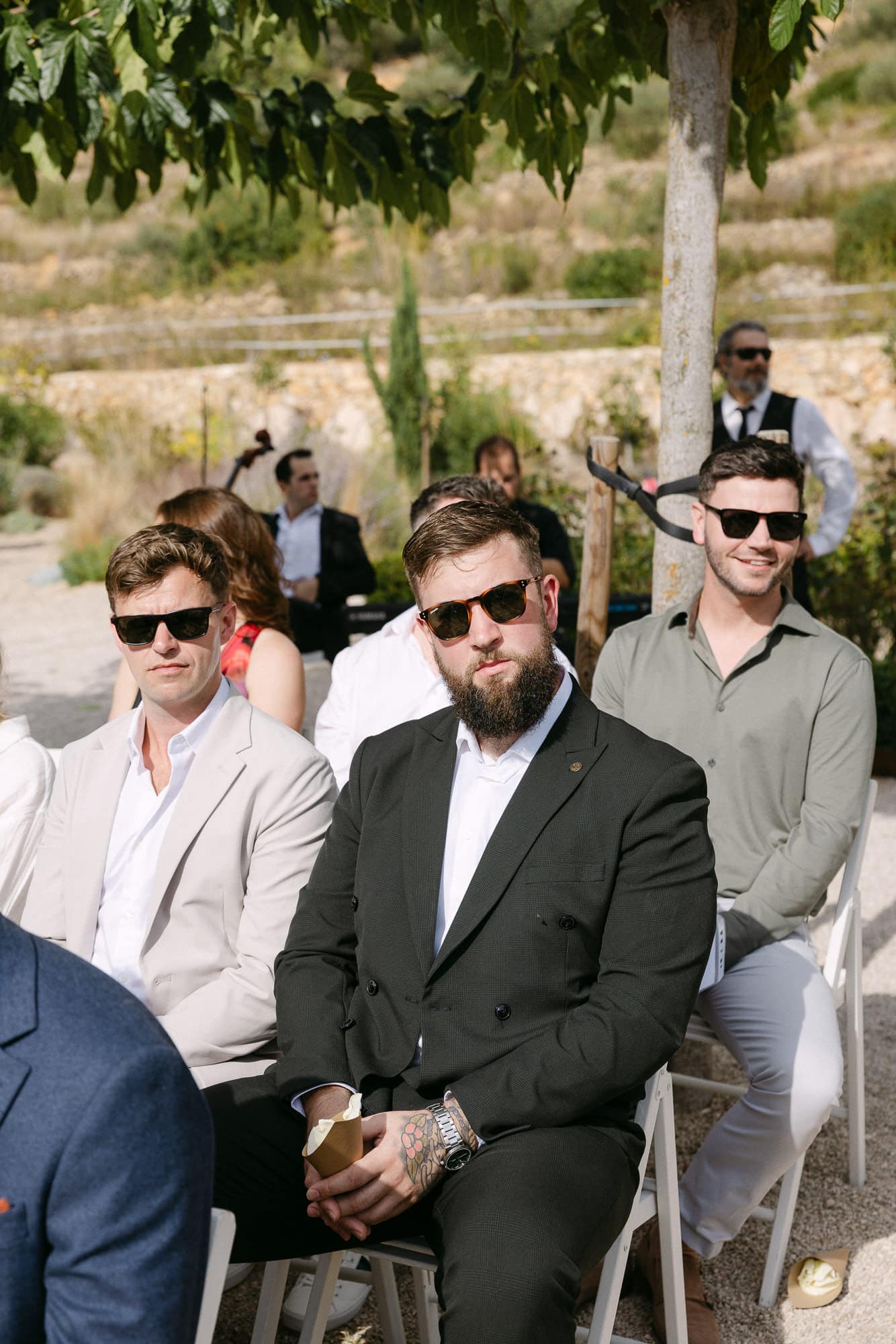 La ceremonia tuvo lugar en el jardín exterior, rodeada de viñas y almendros, bajo el cielo abierto. La luz mediterránea del atardecer y la brisa suave crearon un ambiente elegante y sereno. Los pocos invitados disfrutaron de un espacio íntimo y acogedor, mientras Jillian y Gerard intercambiaban sus votos.
