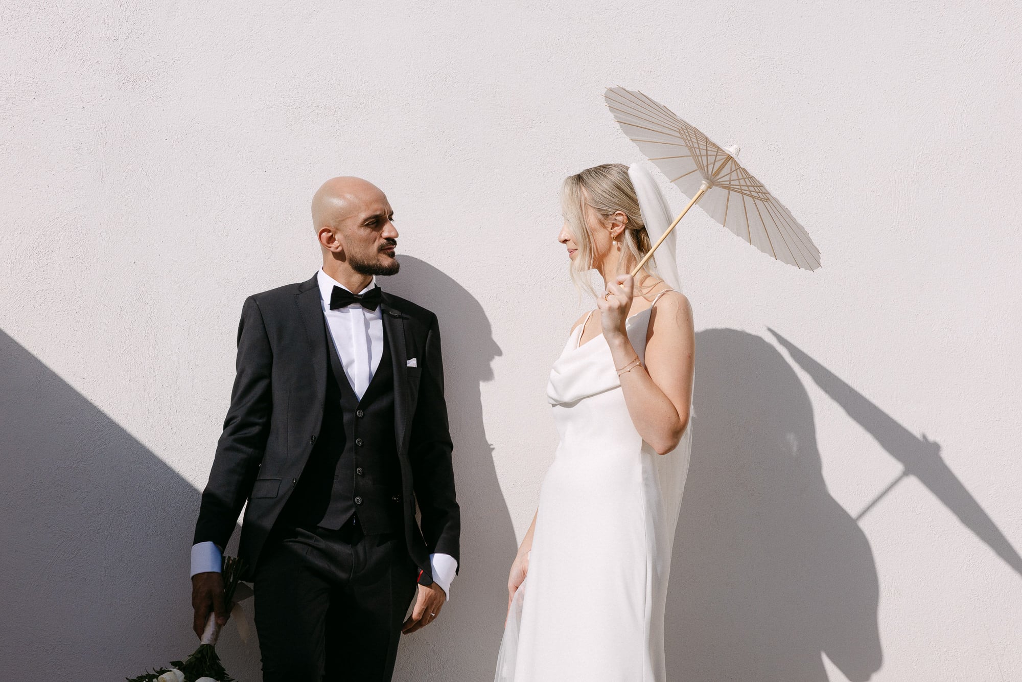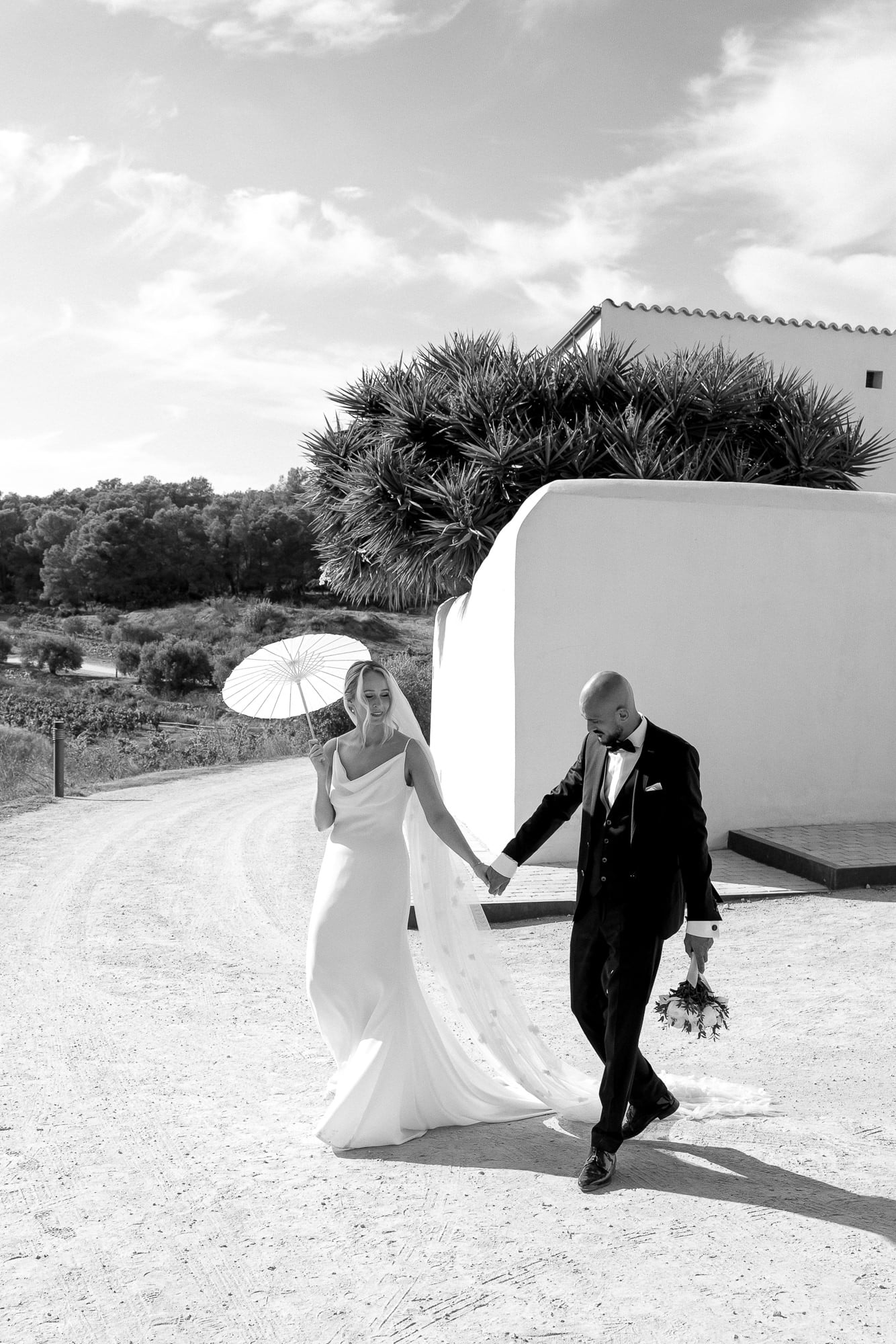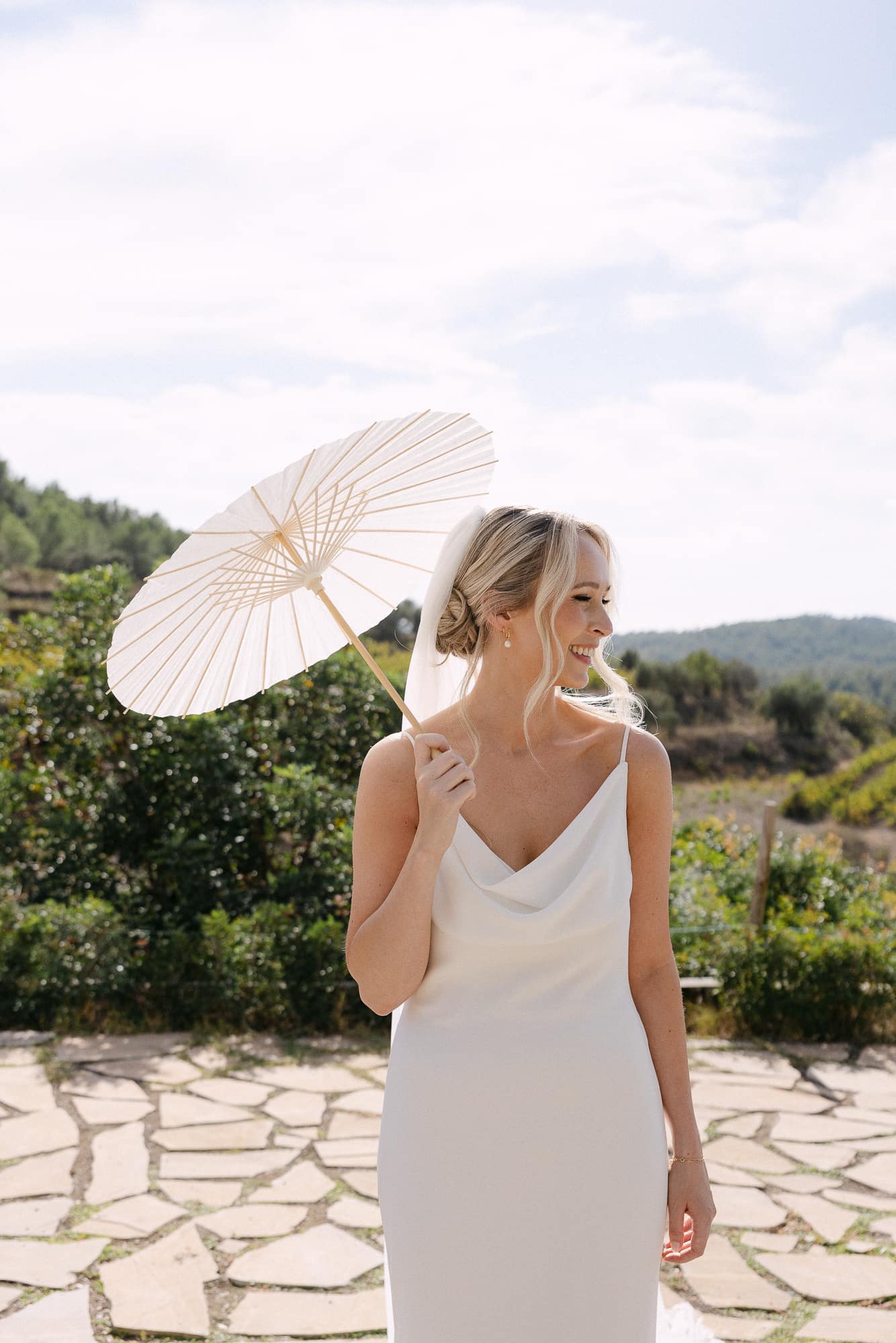 Jillian y Gerard, llegados desde Inglaterra, celebraron su boda en la blanca Masia Cabellut, rodeados de viñas mediterráneas y olivos que aportaban luz y calma a todo el entorno. La boda fue organizada por Vows of Joy Weddings, cuidando cada detalle con discreción y elegancia. Todo el día transcurrió en la masia, desde los preparativos hasta la fiesta, reflejando una celebración íntima, minimalista y mediterránea.